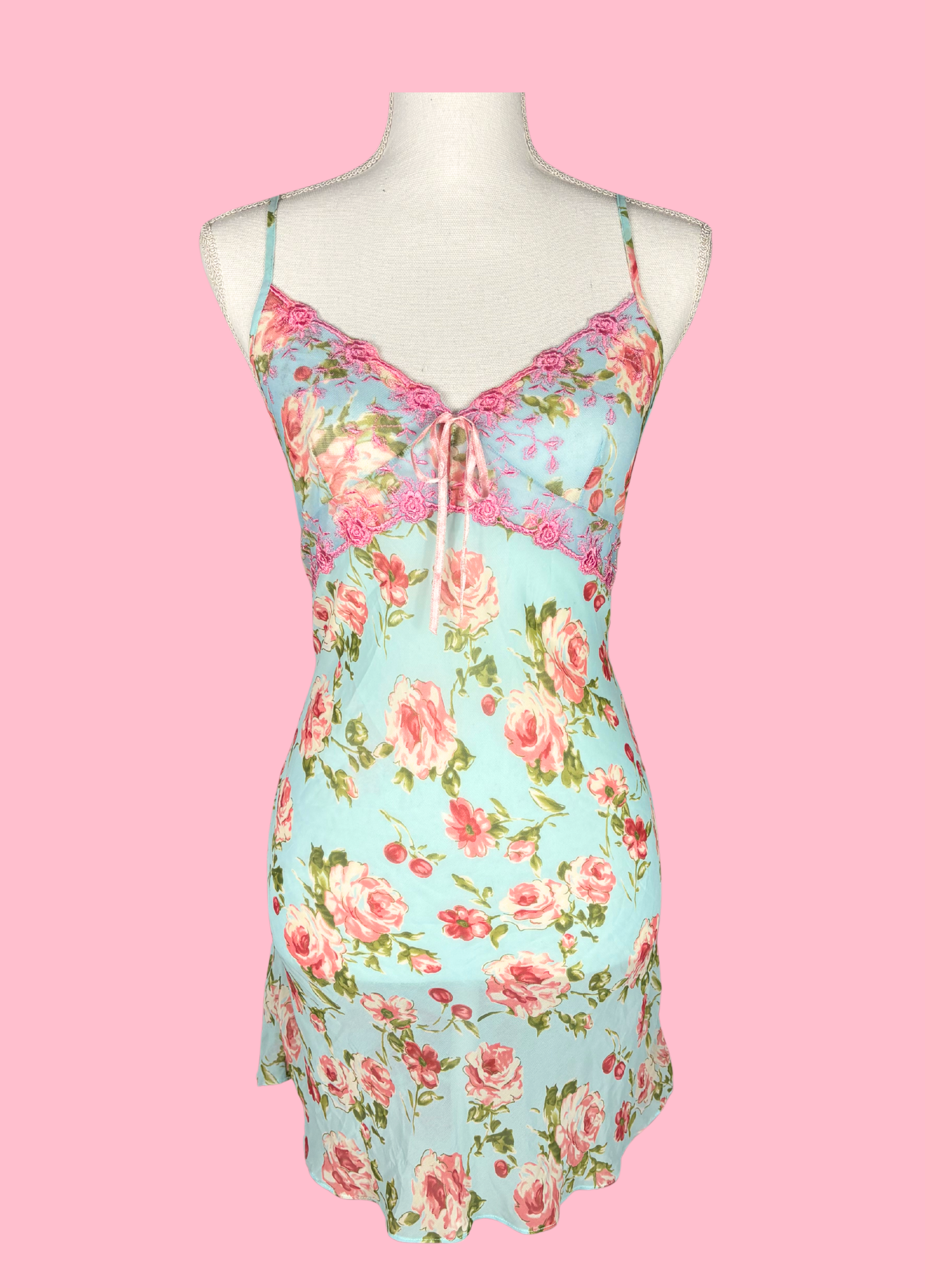 Precioso vestido lencero de Eblin Lingerie estilo fairycore / coquette, con estampado floral y lacito central. El tejido es transparente/de malla. Perfecto para usar como top/vestido de primavera o verano si se usa con algo debajo.