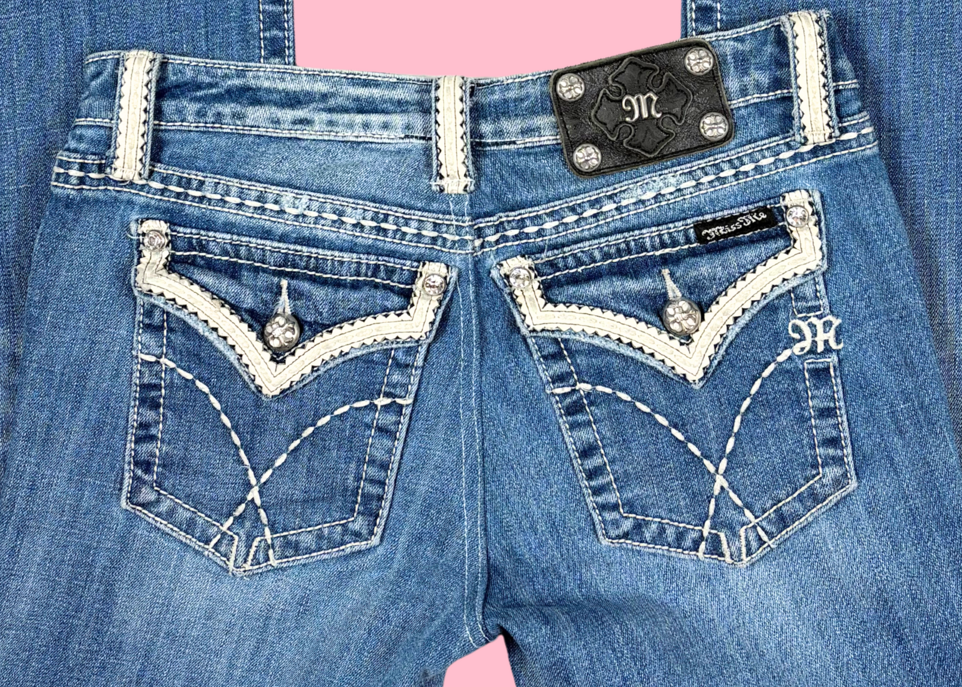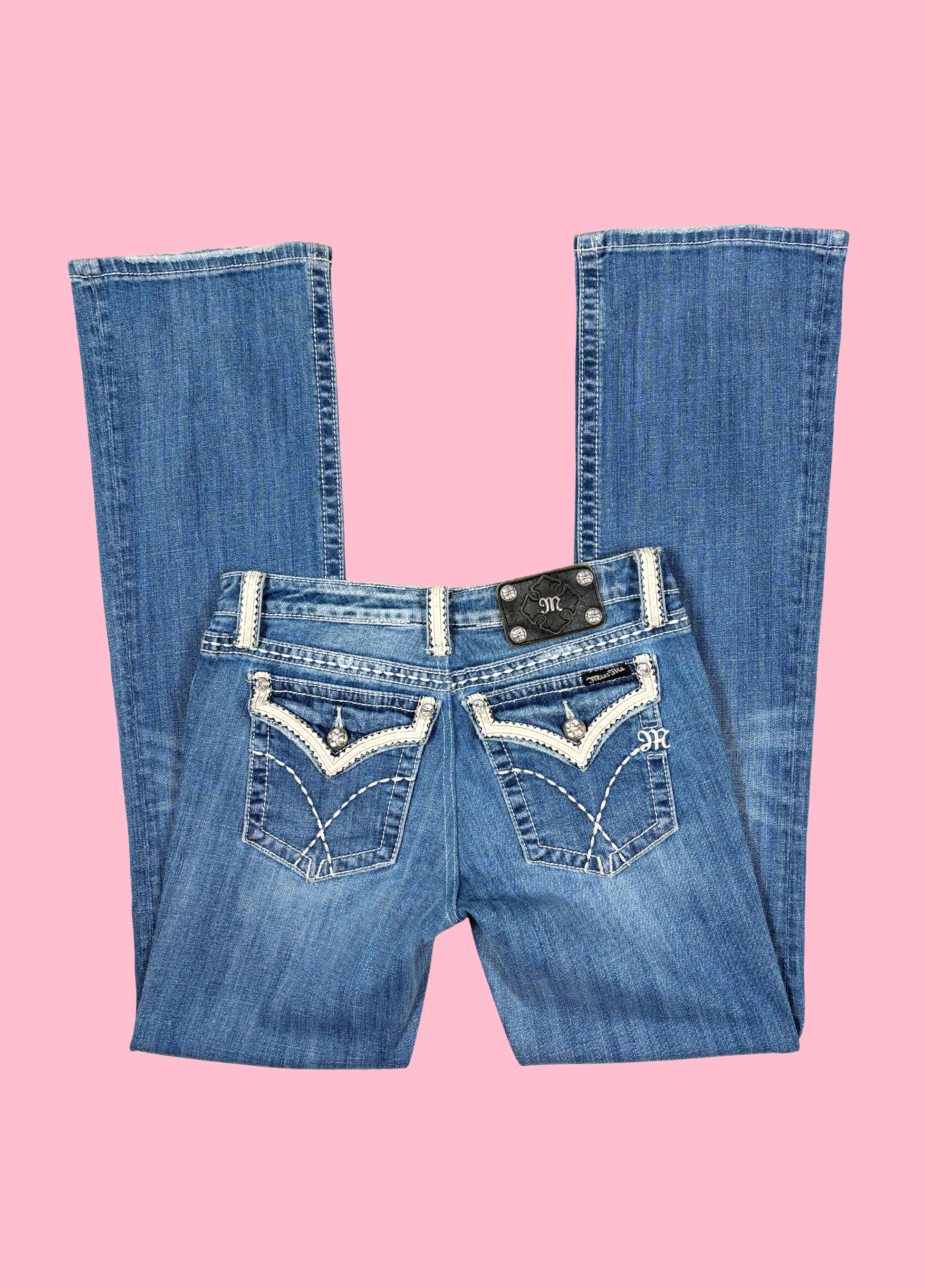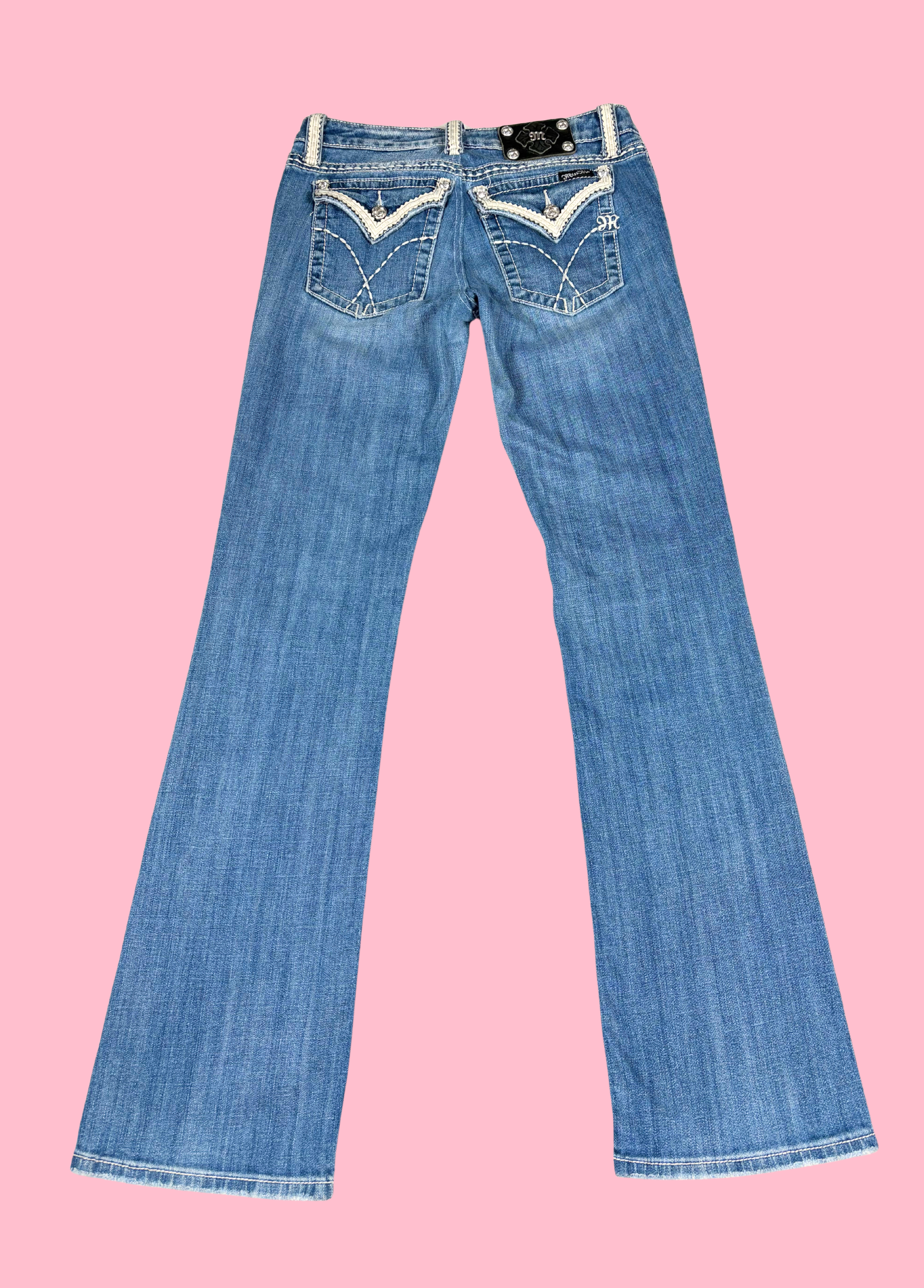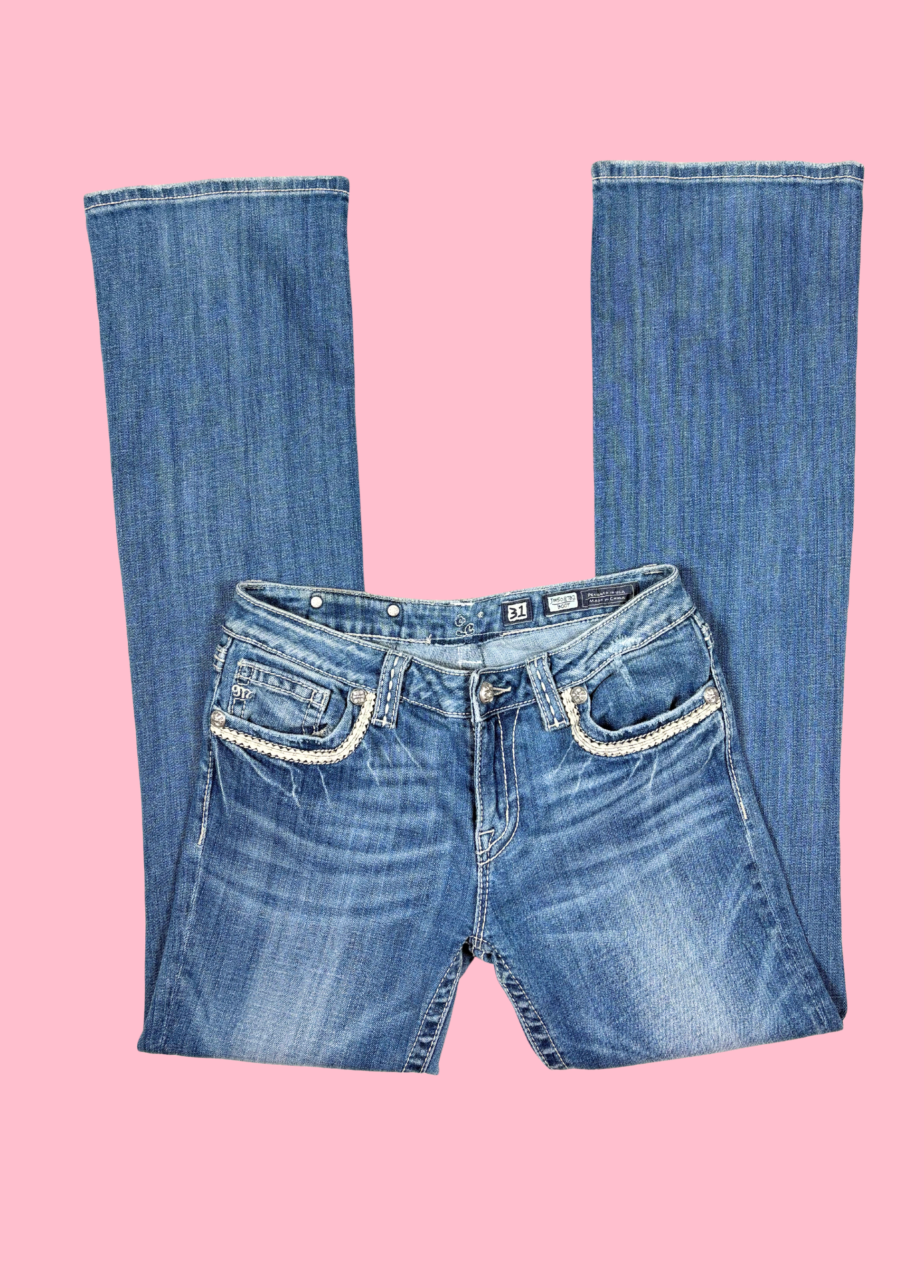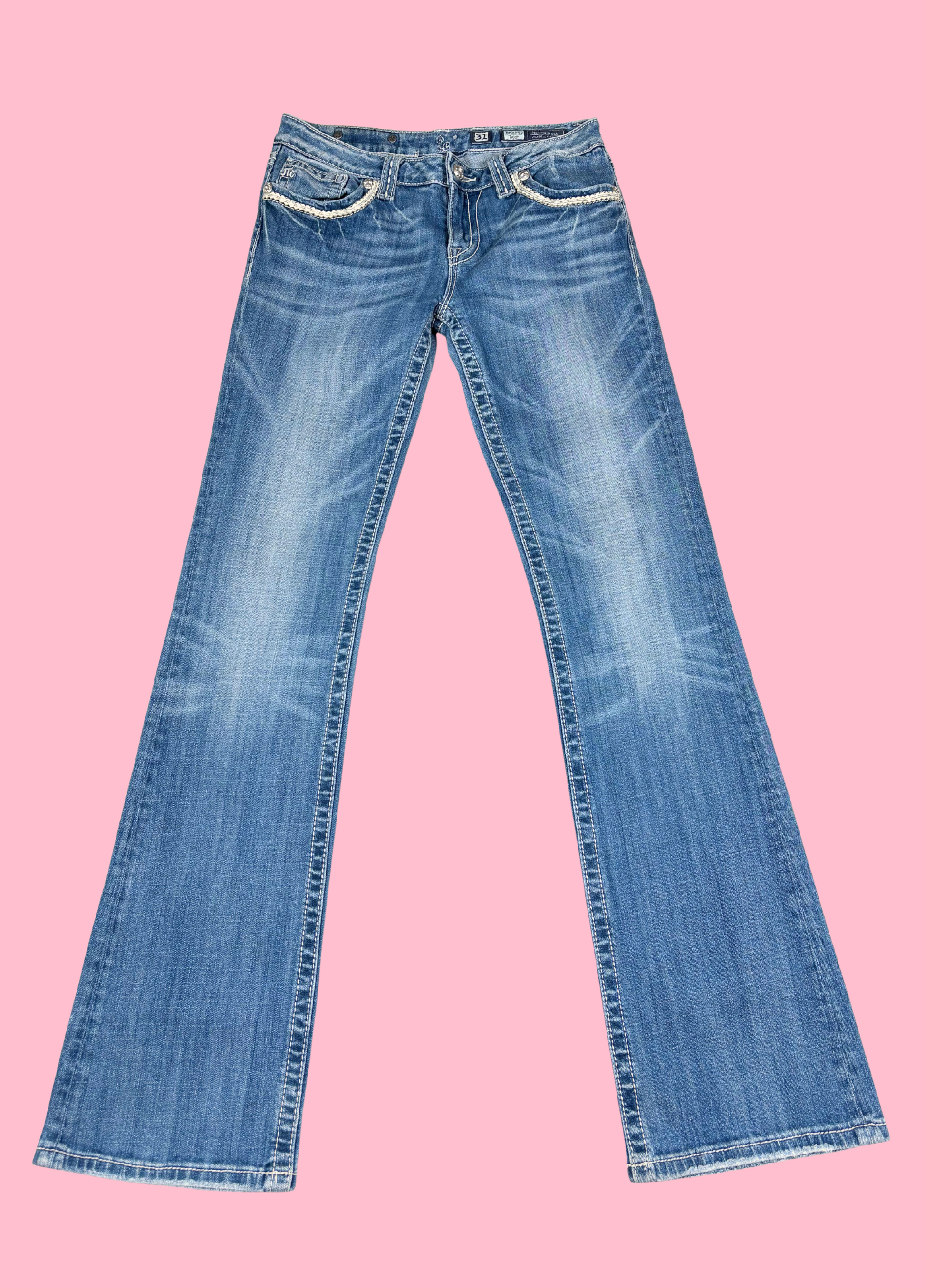 Pantalones bootcut de Miss Me con adornos en los bolsillos. Los pantalones son de talle bajo.