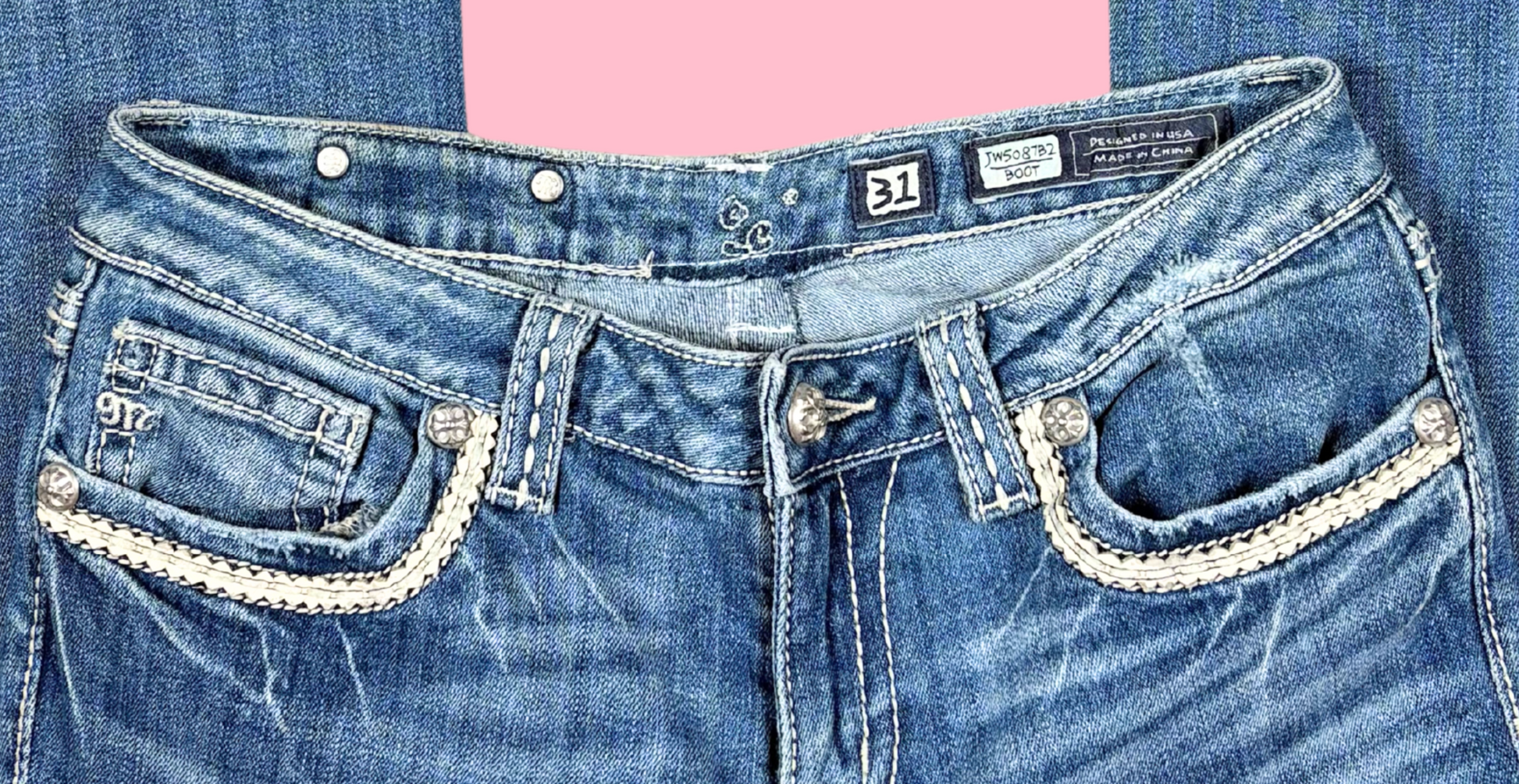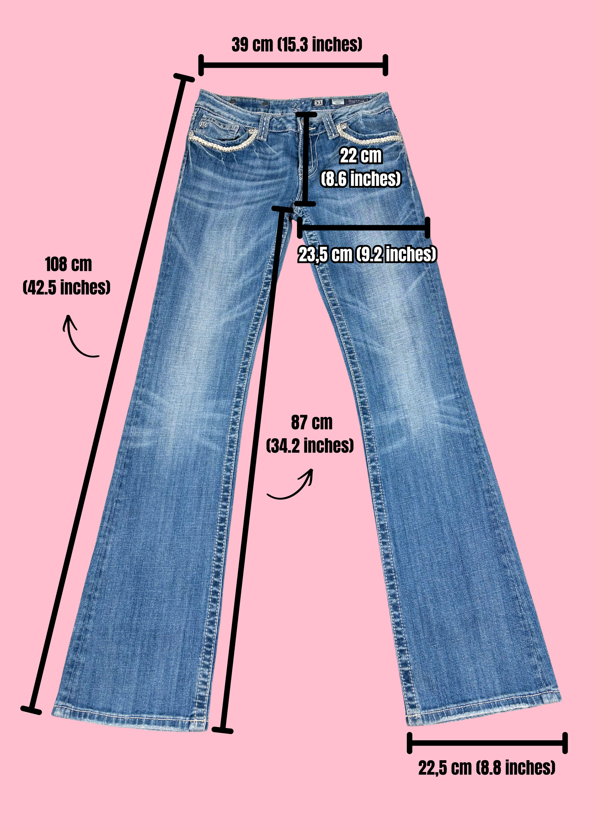Defectos: Los pantalones están en excelentes condiciones, pero como se puede ver en la penúltima foto, la palabra "Miss Me" en el interior de los pantalones está cortada, ya que los pantalones fueron ajustados en la cintura.