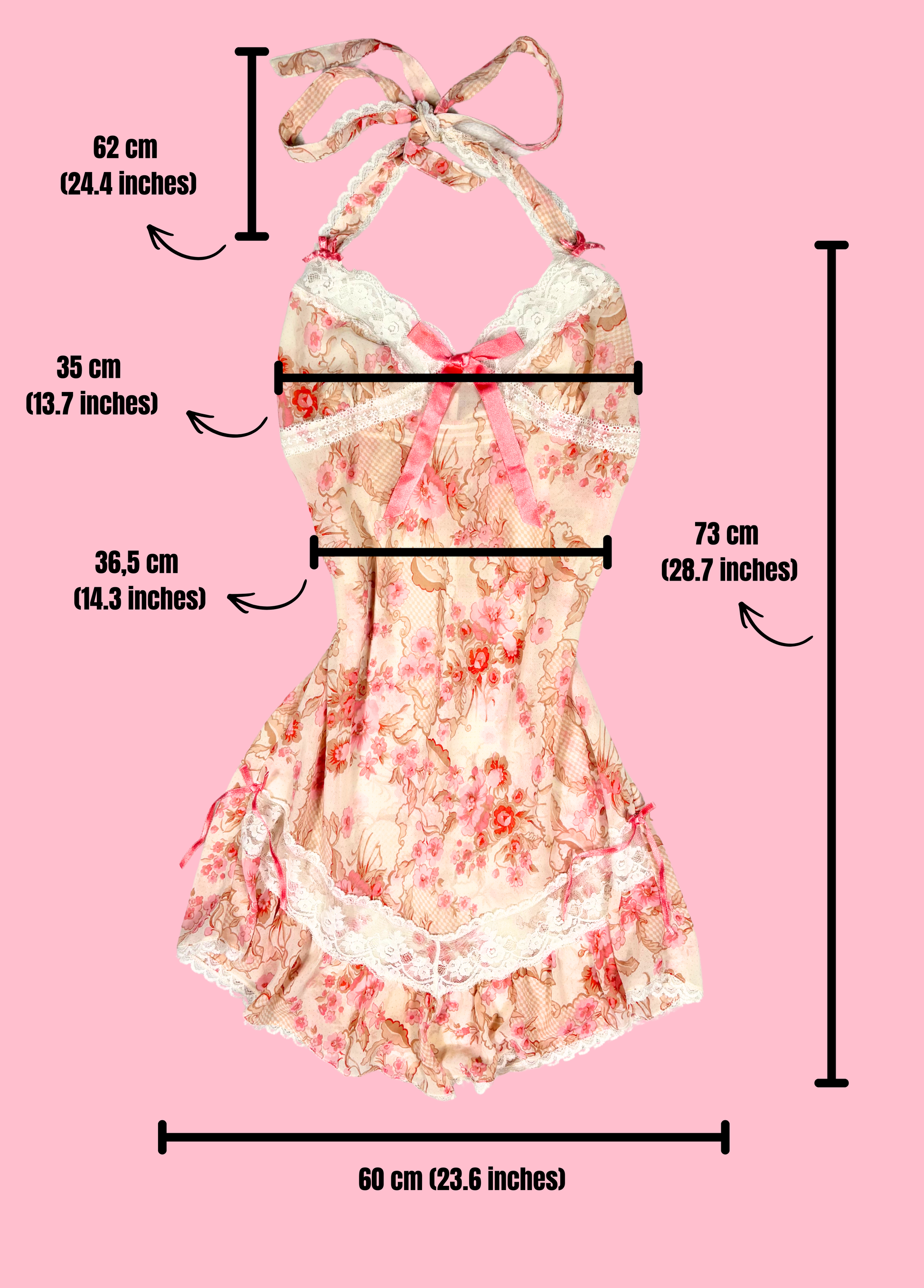 Graziosissimo vestitino slip di Eblin Lingerie in stile fairycore / coquette, con stampa floreale, dettagli in pizzo e fiocchetti. Il tessuto è trasparente/mesh. Perfetto da indossare come top/vestitino primaverile o estivo se indossato con qualcosa sotto.