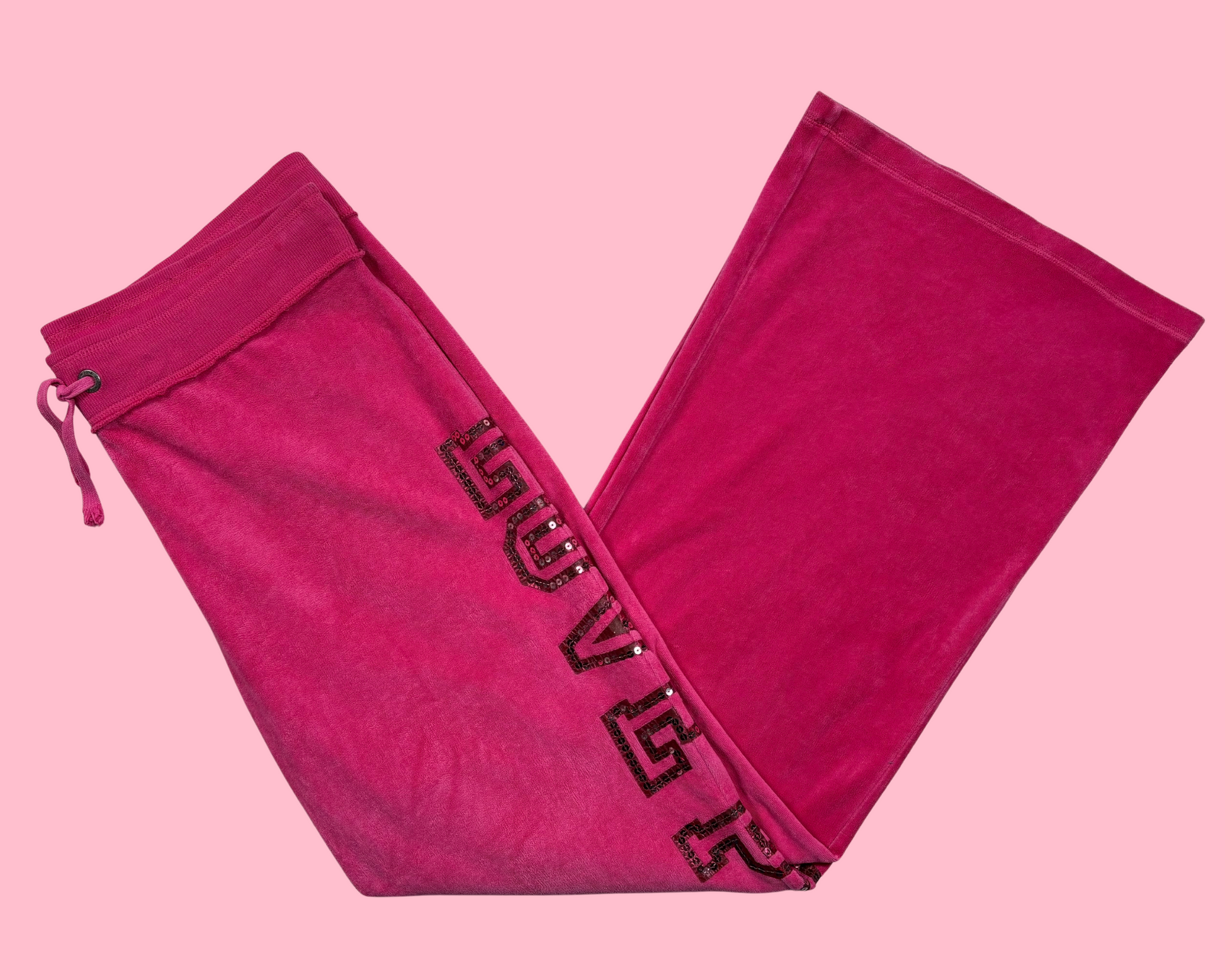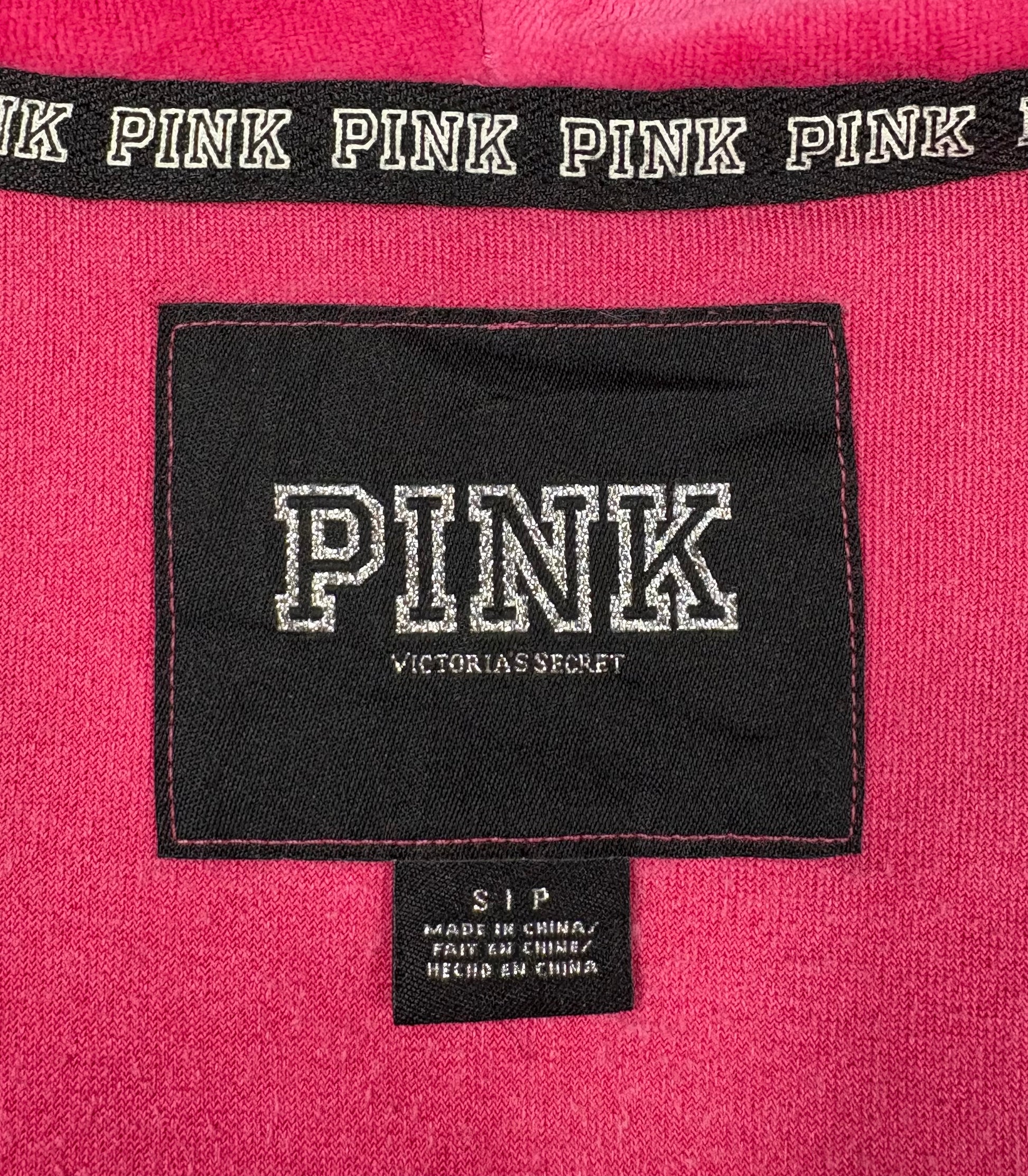 Tuta in velour di Victoria's Secret Pink color rosa, con scritte su fronte e retro.