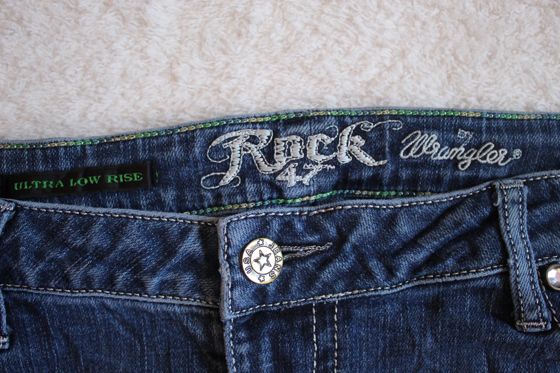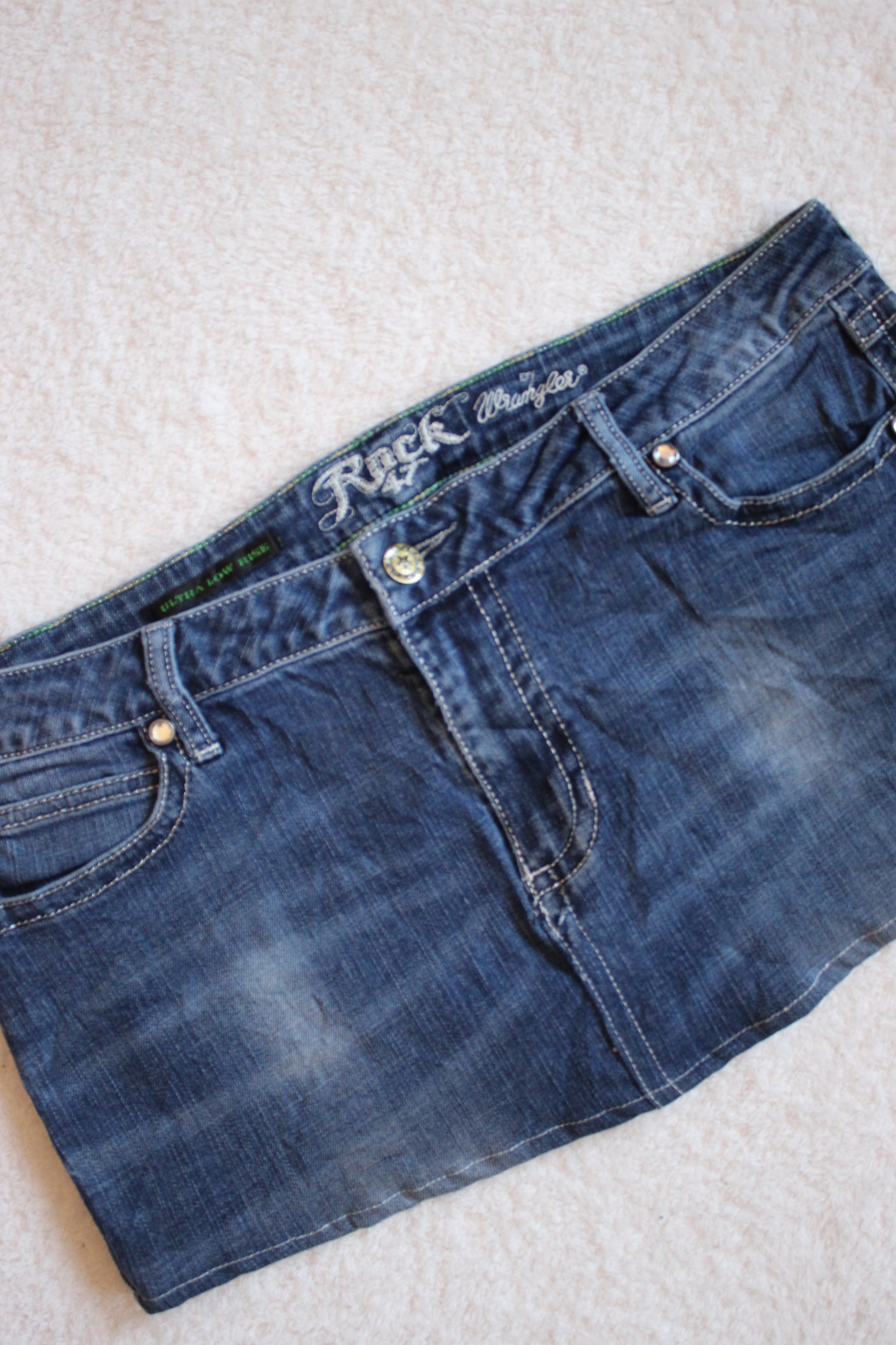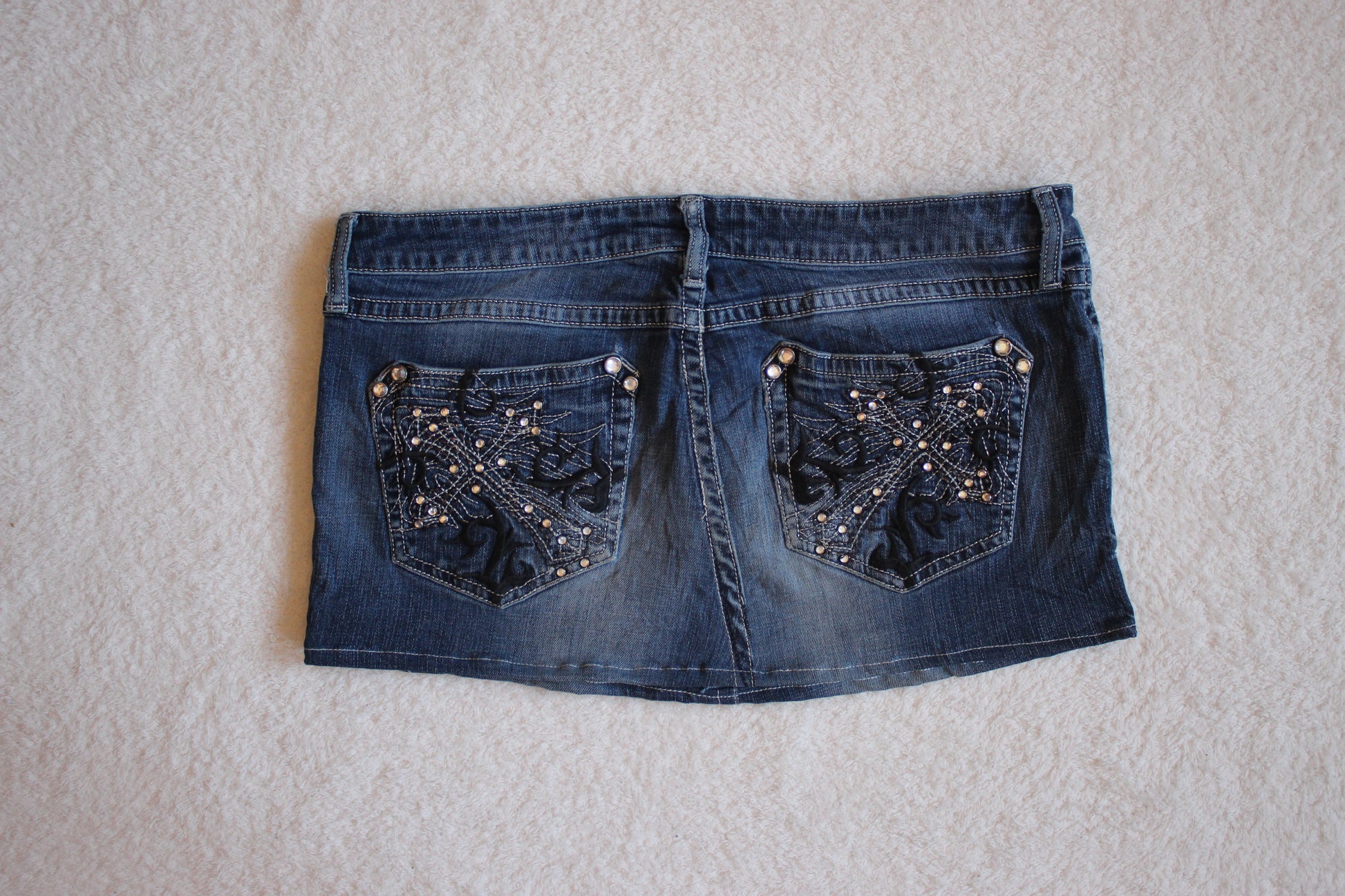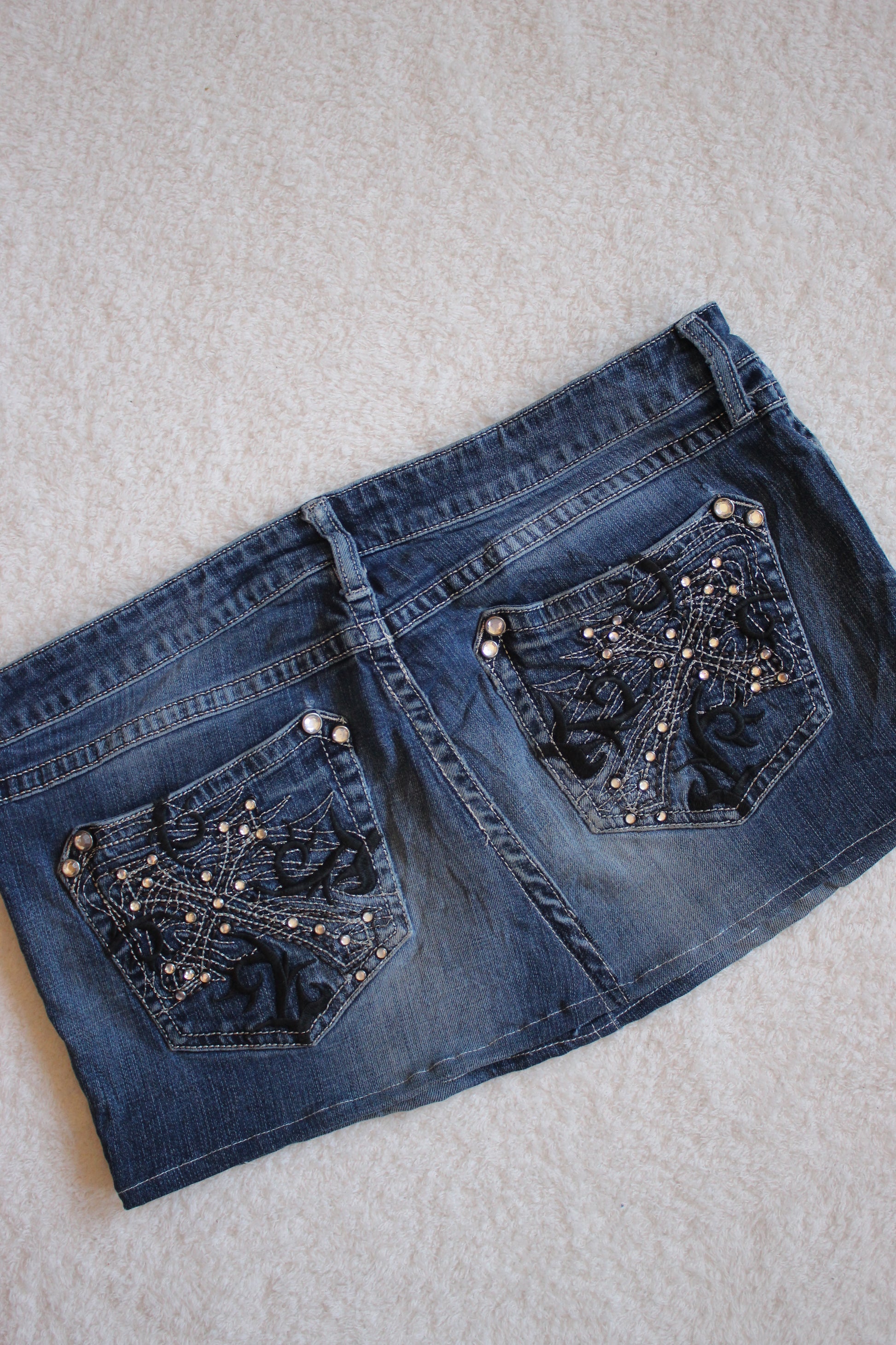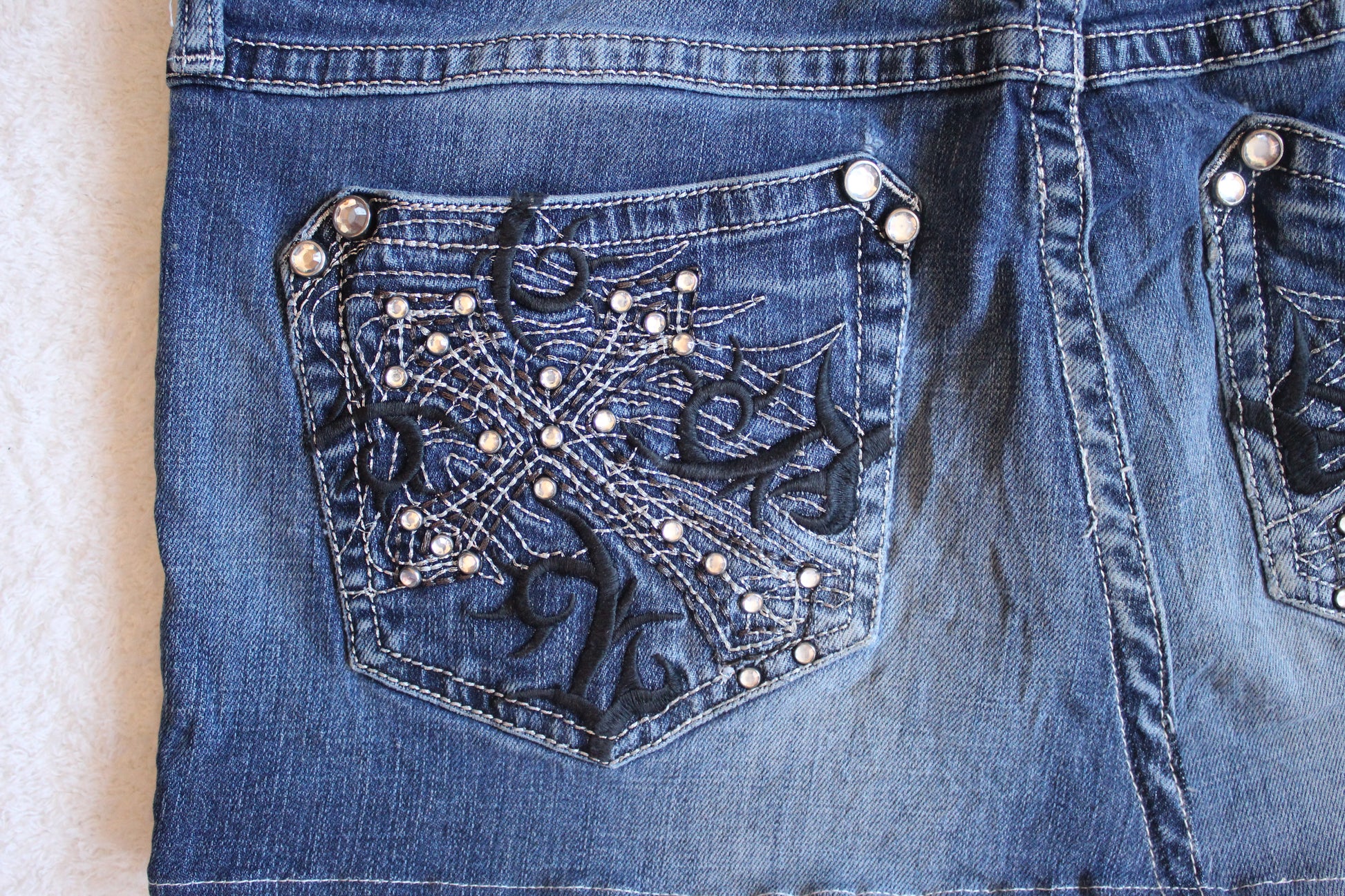 Mini gonna stile anni 2000 di Rock 47 Wrangler, rielaborata a mano da pantaloni, con decorazioni croci sulle tasche.