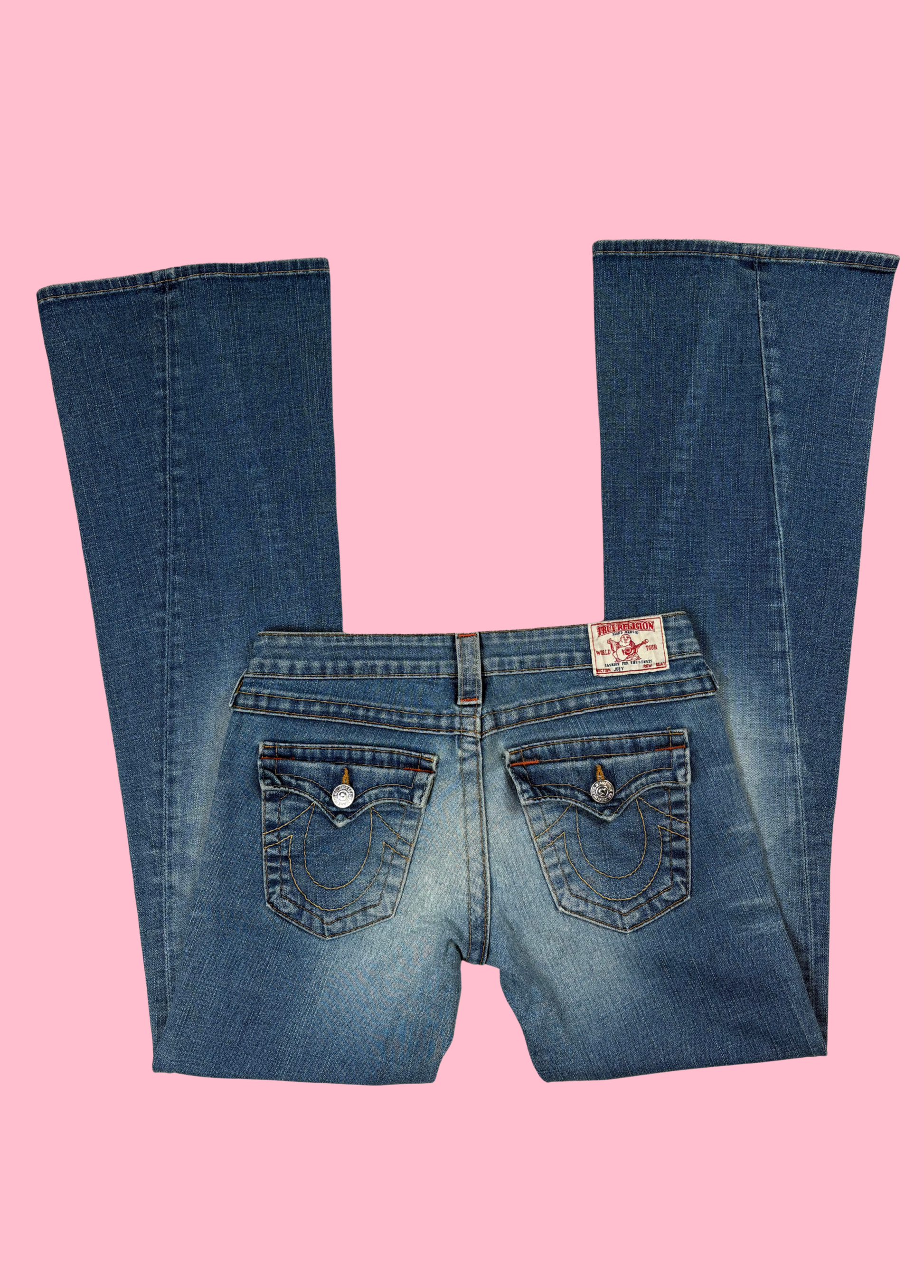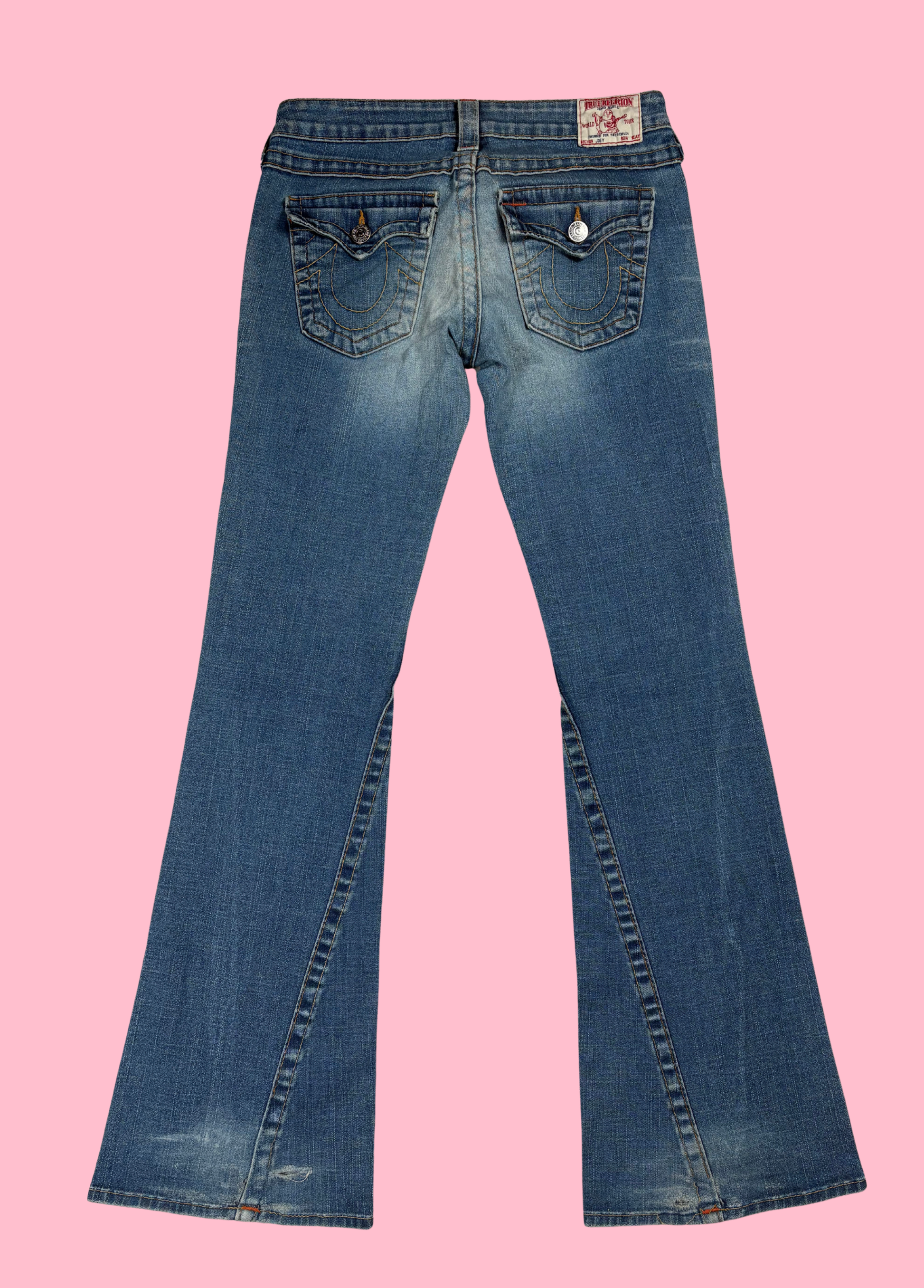 Pantaloni a zampa di True Religion con cuciture sulle tasche. I pantaloni sono a vita bassa.