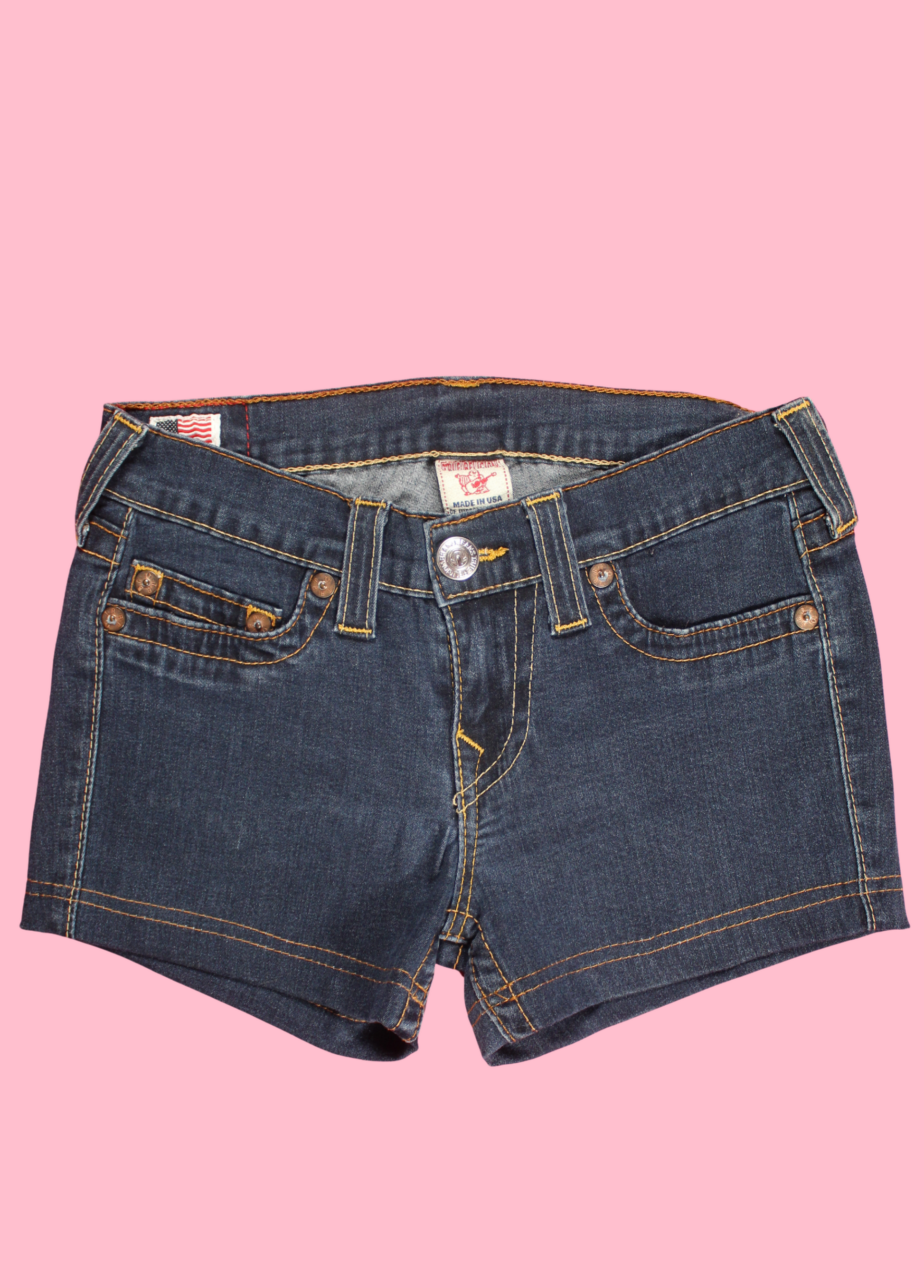 Carinissimi pantaloncini a vita bassa di True Religion, con cuciture sulle tasche. Rielaborati a mano da pantaloni skinny. Leggermente elastici.