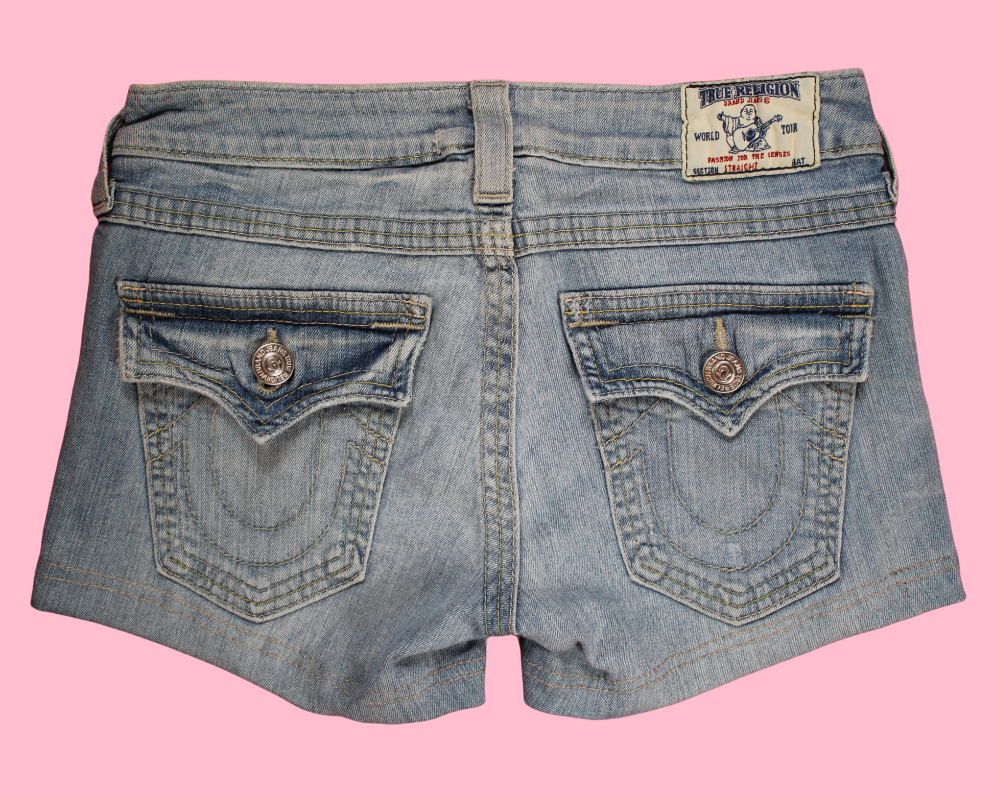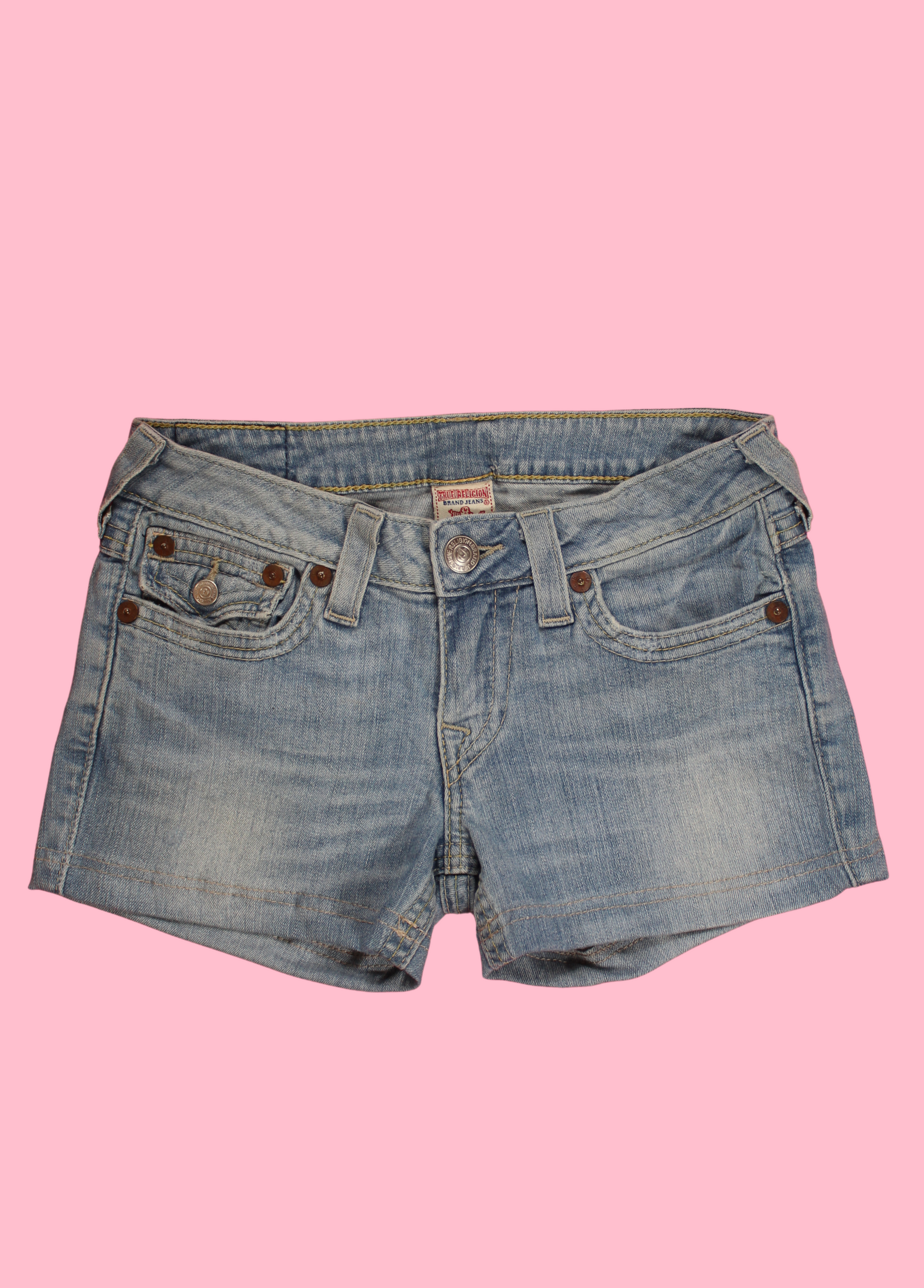Carinissimi pantaloncini a vita bassa di True Religion, con cuciture sulle tasche. Rielaborati a mano da pantaloni skinny. Leggermente elastici.